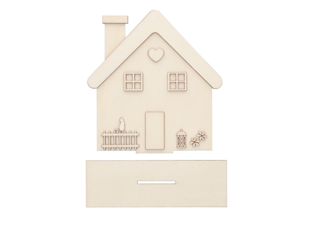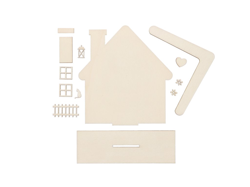 Domek včetně dřevěných výřezů je vyroben z broušené topolové překližky nejvyšší kvality AB/AB o síle 3 mm v přírodním provedení. Laserový řez zaručuje jemné detaily – čelní strana je bez nevzhledných spálených míst, zadní může mít drobné opálení.