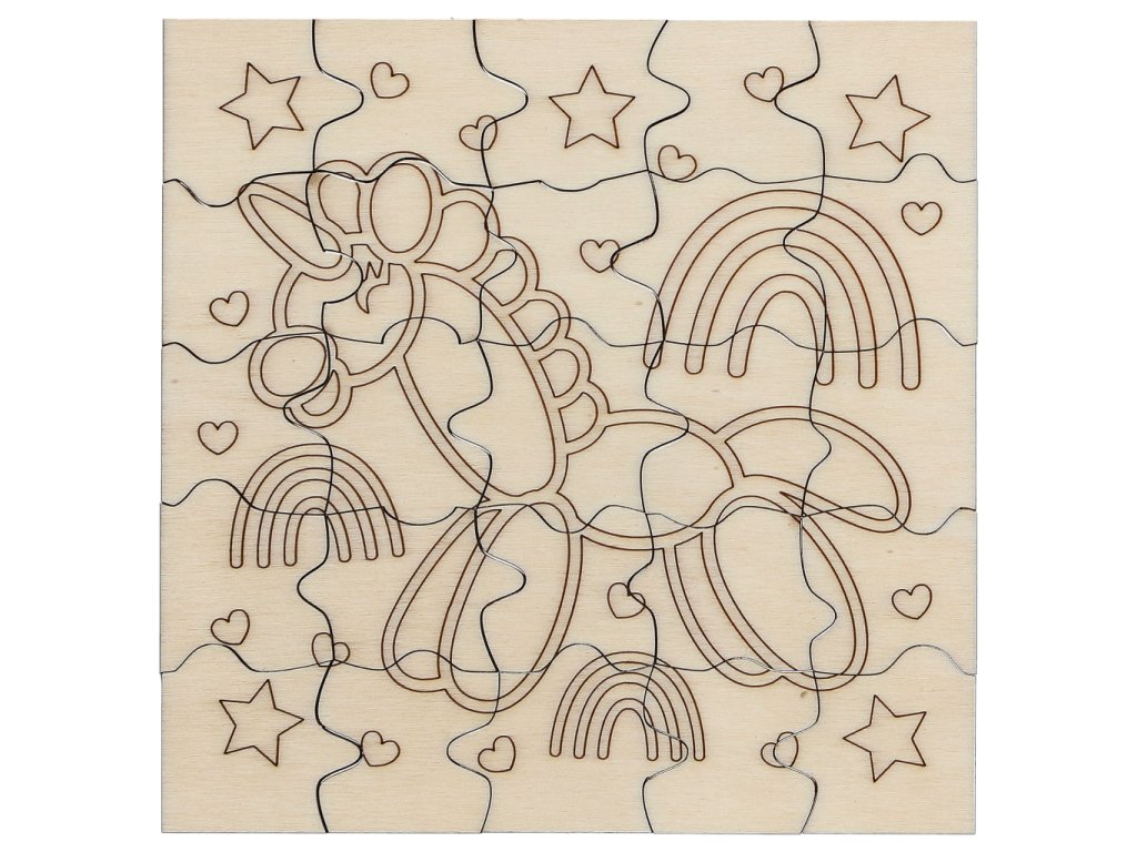 Dřevěné puzzle s kresleným motivem jednorožce je zábavnou skládačkou pro děti. Po složení je možné puzzle vybarvit.