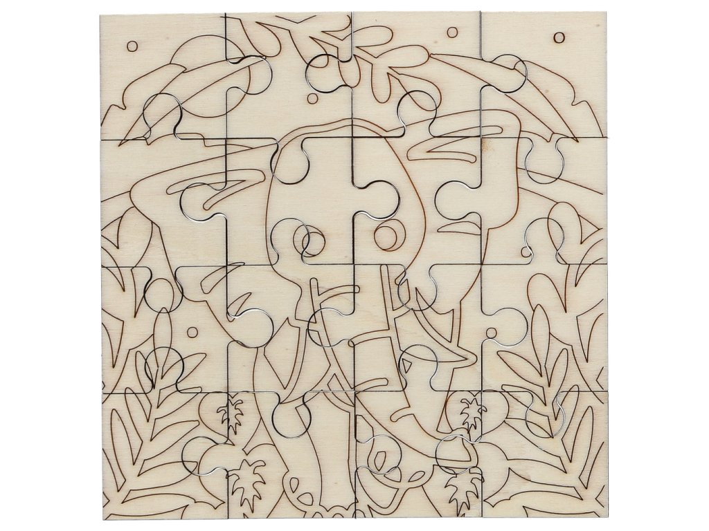 Dřevěné puzzle s kresleným motivem slona v džungli je zábavnou skládačkou pro děti. Po složení je možné puzzle vybarvit.