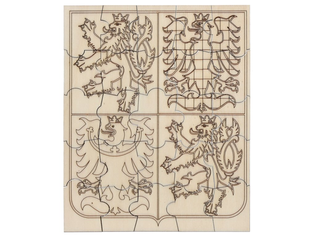 Dřevěné puzzle s kresleným motivem státního znaku České republiky je vhodné jako učební pomůcka do základních škol. Díky složitějšímu tvaru jednotlivých dílků puzzlí doporučujeme pro děti od 9 let. V případě zájmu můžeme dílky zjednodušit, neváhejte se na nás obrátit.